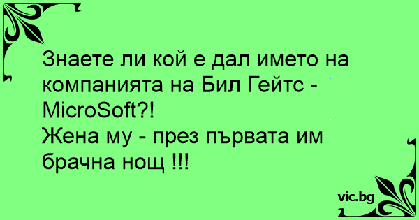 Bill Gates og hans unge kone vågner op efter deres bryllupsnat. Konen siger så: Endelig fandt jeg ud af, hvorfor du kaldte dit firma 'Microsoft' ..." " "