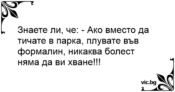 Знаете ли, че: - Ако вместо да тичате в парка, плувате във формалин, никаква болест няма да ви хване!!!