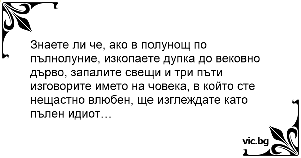 Знаете ли че, ако в полунощ по пълнолуние, изкопаете дупка до вековно дърво, запалите свещи и три пъти изговорите името на човека, в който сте нещастно влюбен, ще изглеждате като пълен идиot…
