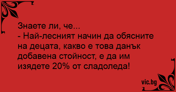 - Най-лесният начин да обясните на децата, какво е това данък добавена стойност, е да им изядете 20% от сладоледа!