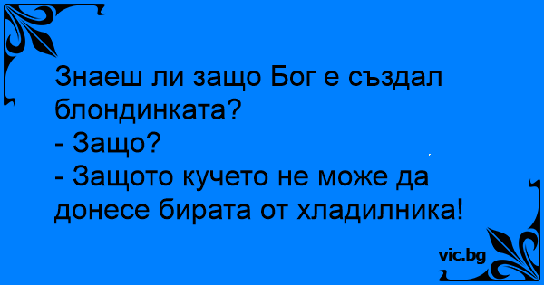 De ce a creat Dumnezeu Blonda? Simplu. oaia nu era in stare sa aduca o cutie de Bere din frigider! Dar cum de a creat Dumnezeu bruneta? Si Mai simplu, nici blonda nu era in stare sa o aduca!