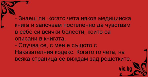 - Знаеш ли, когато чета някоя медицинска книга и започвам постепенно да чувствам в себе си всички болести, които са описани в книгата.