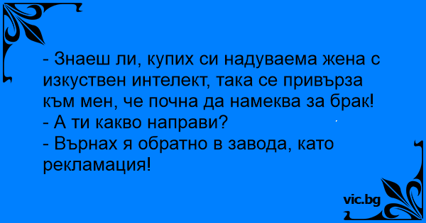 - Знаеш ли, купих си надуваема жена с изкуствен интелект, така се привърза към мен, че почна да намеква за брак!