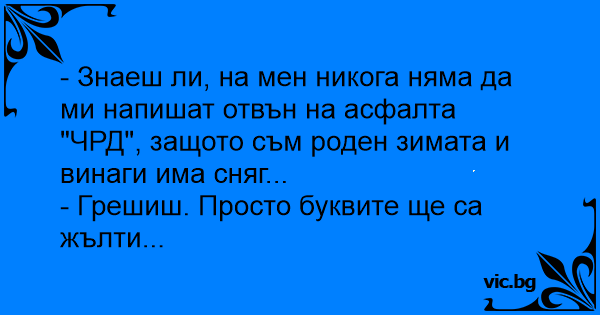 - Знаеш ли, на мен никога няма да ми напишат отвън на асфалта "ЧРД", защото съм роден зимата и винаги има сняг...