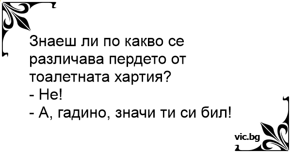 Два мужика в комуналці: — Знаєш, чим відрізняється фіранка від туалетного паперу? — ??? Ні. — Ага, так значить це ти!!