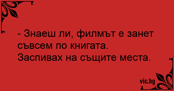 - Знаеш ли, филмът е занет съвсем по книгата. Заспивах на същите места.