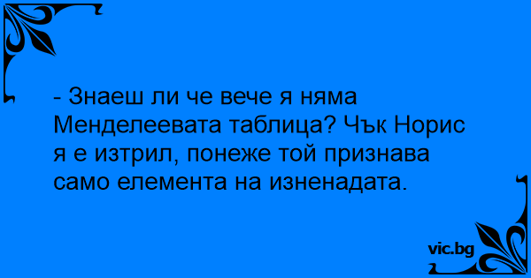 - Знаеш ли че вече я няма Менделеевата таблица? Чък Норис я е изтрил, понеже той признава само елемента на изненадата.