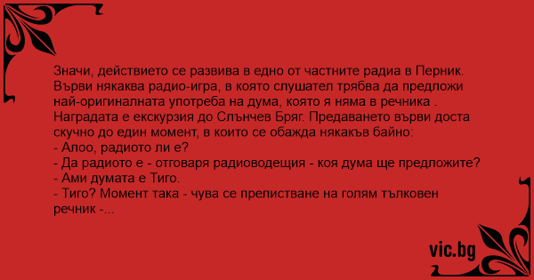 Върви някаква радио-игра, в която слушател трябва да предложи най-оригиналната употреба на дума, която я няма в речника . Наградата е екскурзия до Слънчев Бряг. Предаването върви доста скучно до един момент, в които се обажда някакъв байно: