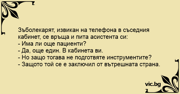 Зъболекарят, извикан на телефона в съседния кабинет, се връща и пита асистента си: