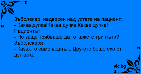 - Avatkaa suunne, sanoi hammaslääkäri potilaalleen. - Voihan nenä, siellä on suurin koskaan näkemäni reikä, suurin koskaan näkemäni reikä, suurin koskaan näkemäni reikä. - Uskotaan, ei tarvitse...