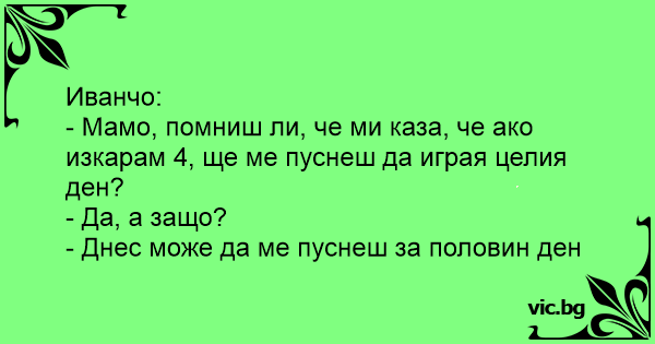 - Мамо, помниш ли, че ми каза, че ако изкарам 4, ще ме пуснеш да играя целия ден?