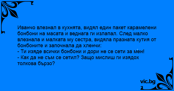 Иванчо влезнал в кухнята, видял един пакет карамелени бонбони на масата и веднага ги излапал. След малко влезнала и малката му сестра, видяла празната кутия от бонбоните и започнала да хленчи: