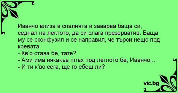 Иванчо влиза в спалнята на родителите си и вижда баща си, който седи на леглото и се мъчи да си сложи презерватив.