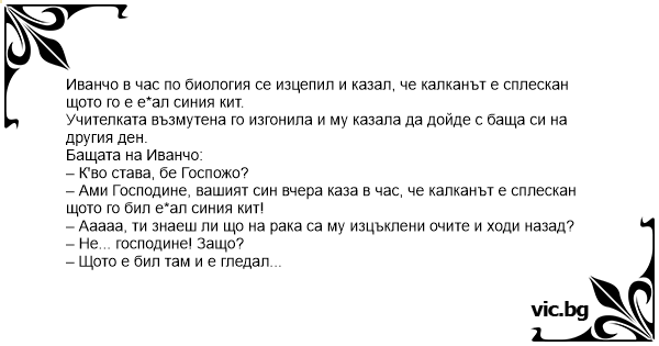 – Ами Господине, вашият син вчера каза в час, че калканът е сплескан щото го бил eбaл синия кит!