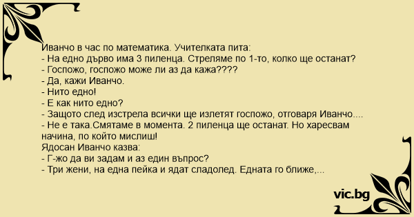 La ora de matematica invatatoarea ii intreaba pe copii: - Trei vrabii stau pe o craca. Pe una o impuscam. Cite ramin atunci pe craca? - Nici una, pentru ca celalalte isi iau zborul. - Matematic nu...