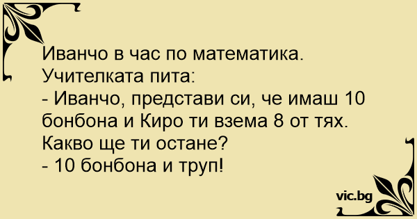 - Иванчо, представи си, че имаш 10 бонбона и Киро ти взема 8 от тях. Какво ще ти остане?