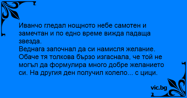 Иванчо видял падаща звезда и в бързината се зачудил какво да си пожелае.