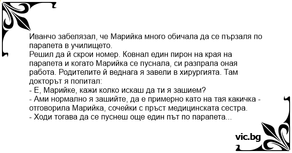 Решил да й скрои номер. Ковнал един пирон на края на парапета и когато Марийка се пуснала, си разпрала оная работа. Родителите й веднага я завели в хирургията. Там докторът я попитал: