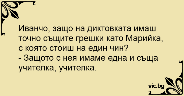 Иванчо, защо на диктовката имаш точно същите грешки като Марийка, с която стоиш на един чин?