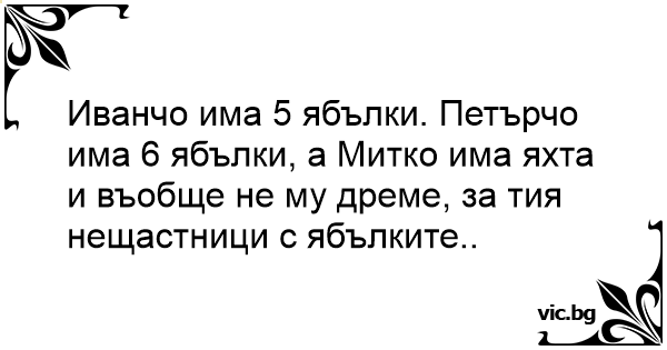Иванчо има 5 ябълки. Петърчо има 6 ябълки, а Митко има яхта и въобще не му дреме, за тия нещастници с ябълките..