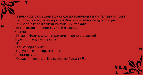 Иванчо иска разрешение да отиде до тоалетната и учителката го пуска. В кенефа, обаче, няма хартия и Иванчо си забърсва дупeto с ръка. Връща се в клас и стиска юмруче. Учителката: