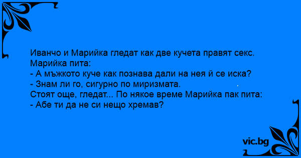 Иванчо и Марийка гледат как две кучета правят cekc.