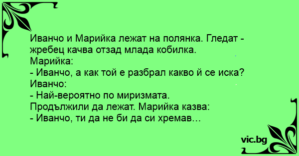 Иванчо и Марийка лежат на полянка. Гледат - жребец качва отзад млада кобилка.