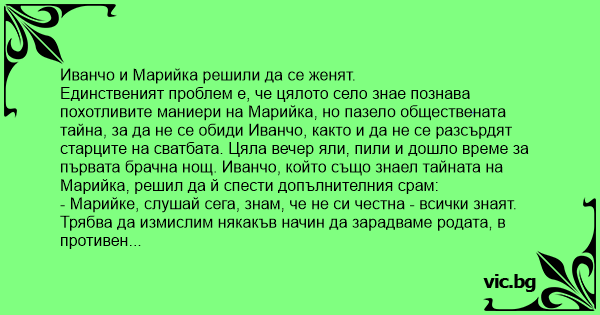 Единственият проблем е, че цялото село знае познава похотливите маниери на Марийка, но пазело обществената тайна, за да не се обиди Иванчо, както и да не се разсърдят старците на сватбата. Цяла вечер яли, пили и дошло време за първата брачна нощ. Иванчо, който също знаел тайната на Марийка, решил да й спести допълнителния срам: