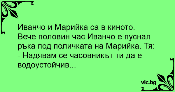 Вече половин час Иванчо е пуснал ръка под поличката на Марийка. Тя: