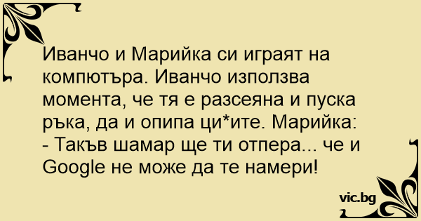 Иванчо и Марийка си играят на компютъра. Иванчо използва момента, че тя е разсеяна и пуска ръка, да и опипа цициte. Марийка: