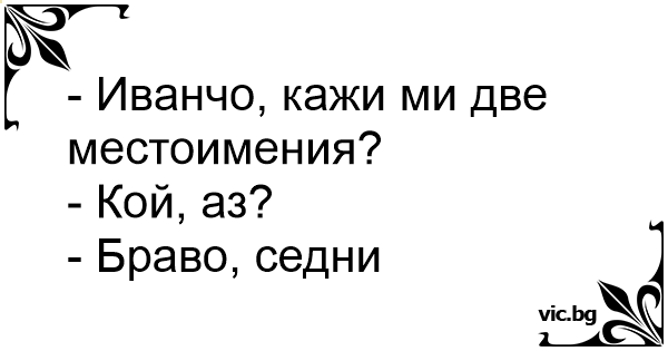 Læreren: "Sig mig 2 personlige stedord." Eleven: "Hvem? Mig?" Læreren: Fuldstændig korrekt!"