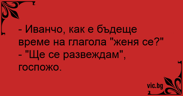 - Иванчо, как е бъдеще време на глагола "женя се?"