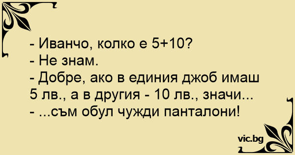 Панталони Το παντελόνι του Τοτού учительница спрашивает: - вова, если в одном кармане брюк у тебя... Учителка пита: Toto a du mal à comprendre l'arithmétique. La maîtresse essaie de lui faire comprendre grâce à des exemples: Teacher: “If you reached in your right pocket and found a nickel, and you reached in your left pocket and found another one, what would you have?” O professor de matemática pergunta ao aluno: — Joãozinho. — Pode perguntar, professor. — Se você tivesse trinta reais num bolso e setenta no outro, o que teria? — A calça de uma outra pessoa, professor! - Иванчо, колко прави 10+5? - Не си спомням. - Добре, ако имаш в единия джоб 10 лв., а в другия 5 лв., значи ... - ... Значи съм обул чужди панталони ... - A ver, Jaimito, si en un bolsillo tienes 10.000 pesetas y en otro 34.000 pesetas, ¿Qué tienes en total? - Pues los pantalones de otro. Opettaja matikan tunnilla ”Jos sinulla on toisessa taskussa 5 euroa ja toisessa 10 euroa, mitä sinulla silloin on?” ”Jonkun toisen housut.” Vastasi Kalle. Bir gün öğretmen çocuğa sormuş: bi elini sağ cebine attın 10 lira çıktı diğer elinide sol cebşne attın 5 lira çıktı şimdi senin neyin oldu? vala öğretmenim galiba üzerimde başka birinin pantolonu var. Opettaja yritti opettaa oppilailleen matematiikkaa. - Jos sinulla on 20€ toisessa taskussa ja toisessa 30€, mitä sinulla silloin on? Pikku-Ville vastasi: - Jonkun toisen housut. Öğretmen çocuğa sormuş; - Elini pantolonun sağ cebine attın ve bir 200 lira çıkarttın, sol cebinden de 100 lira çıktı. Senin şimdi kaç paran var? Öğretmen çocuğun 300 liram var cevabını vermesini... Toto a bien du mal avec les additions. La maîtresse lui demande : - Dis-moi, Toto, si tu mets une main dans ta poche droite et que tu en sors 10 €, puis tu mets l'autre main  dans ta poche gauche... Öğretmen Aliyi tahtaya kaldırır ve; - Ali bak cebinde 10 TL var bende sana 15 TL verdim. Cebinde ne kadar var. - Cebimde ne var bilmem ama galiba üstümde başkasının pantolonu var. La maestra di matematica si rivolge a Pierino per una domanda inerente la lezione effettuata: - Ascoltami bene Pierino, se tu avessi nella tasca destra dei tuoi pantaloni 100 Euro, e in quella...