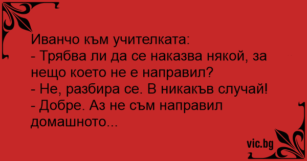 Na začátku hodiny se přihlásil Pepíček: „Paní učitelko, mohu být potrestán za něco, co jsem neudělal?” „No, to v žádném případě, Pepíčku.” „Tak to mi spadl kámen ze srdce - já jsem totiž neudělal...