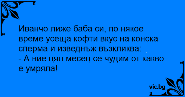 Иванчо лиже баба си, по някое време усеща кофти вкус на конска cпepma и изведнъж възкликва: