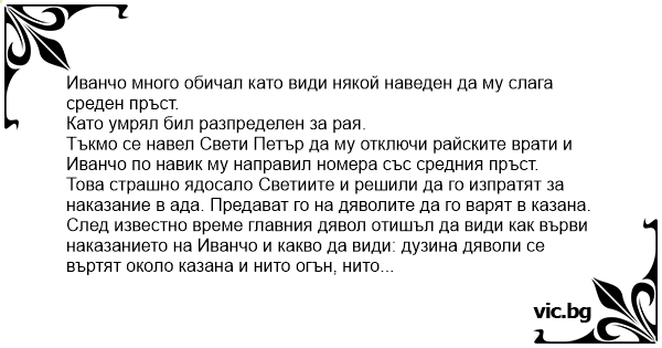 Тъкмо се навел Свети Петър да му отключи райските врати и Иванчо по навик му направил номера със средния пръст.