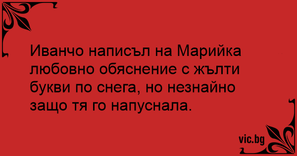 Иванчо написъл на Марийка любовно обяснение с жълти букви по снега, но незнайно защо тя го напуснала.