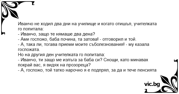 - Иванчо, ти защо ме излъга за баба си? Снощи, като минавах покрай вас, я видях на прозореца?