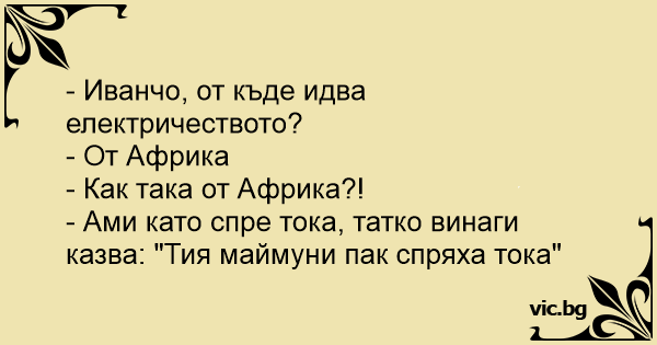 Деца, знаете ли, откъде идва електричеството? - пита учителка. Der Physiklehrer fragt die Schüler wo der Strom herkommt. Fritzchen meldet sich sofort und sagt: Pani pyta Jasia: - Jasiu, powiedz nam skąd się bierze prąd? A Jasiu na to: - Z Afryki. - A czemu akurat z Afryki? - Bo jak wyłączą prąd, to tata zawsze mówi - znowu te małpy wyłączyły prąd. A tanár felelteti Pistikét: - Pistike, tudod-e honnan jön az áram? - Az őserdőből! - Ezt miből gondolod? - Mert amikor a múltkor elment az áram, apa azt mondta, na már megint lekapcsolták az áramot... Вчителька на уроці запитує: — Діти, хто знає, звідки береться електрика? — З дому розпусти, — відповідає Вовочка. — А чому ти так кажеш? — Сьогодні ранком, коли тато голився, й зникла електрика,...