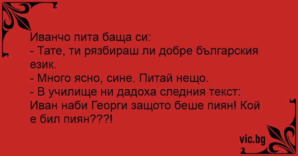 - В училище ни дадоха следния текст: Иван наби Георги защото беше пиян! Кой е бил пиян???!