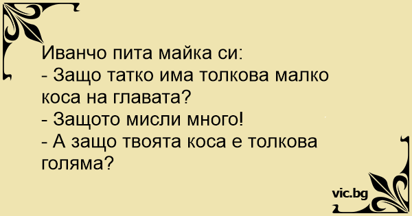 Janitis jauta mammai-Mammu, kapec tetim nav matu? -Tapec, ka tetis daudz doma. -A kapec tev tad ir tik daudz? -Aizveries un ed!