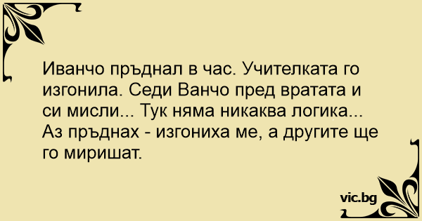 Иванчо пръднал в час. Учителката го изгонила. Седи Ванчо пред вратата и си мисли... Тук няма никаква логика... Аз пръднах - изгониха ме, а другите ще го миришат.