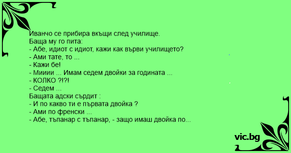 - Абе, идиot с идиot, кажи как върви училището?