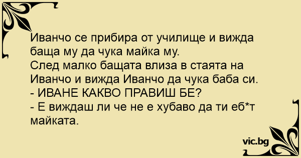 Иванчо ебал баба си в кухнята на масата и в това време влезнал на иванчо баща му и казал: