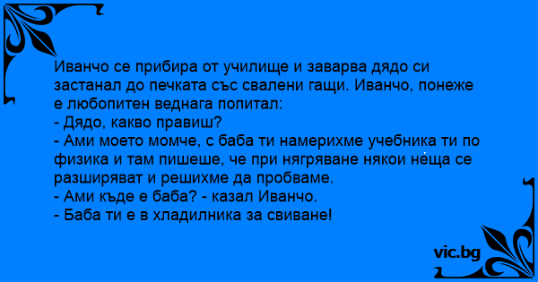 Иванчо се прибира от училище и заварва дядо си застанал до печката със свалени гащи. Иванчо, понеже е любопитен веднага попитал: