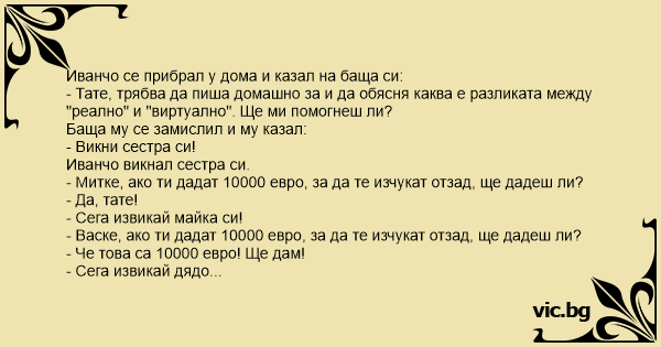 - Тате, трябва да пиша домашно за и да обясня каква е разликата между "реално" и "виртуално". Ще ми помогнеш ли?