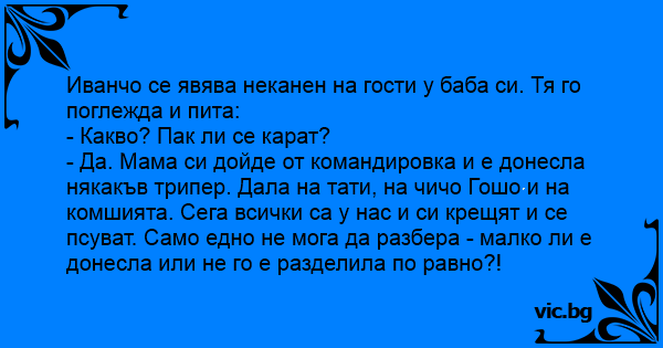- Да. Мама си дойде от командировка и е донесла някакъв трипер. Дала на тати, на чичо Гошо и на комшията. Сега всички са у нас и си крещят и се псуват. Само едно не мога да разбера - малко ли е донесла или не го е разделила по равно?!