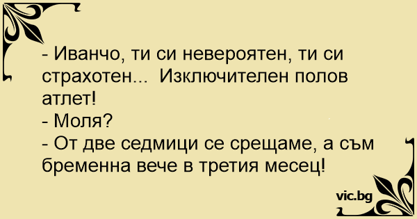 - Скъпи, ти си невероятен - възкликва в леглото млада дама - За първи път сме заедно, а аз вече съм бременна в третия месец!