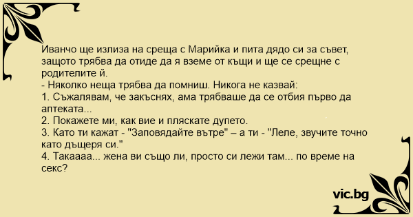 Иванчо ще излиза на среща с Марийка и пита дядо си за съвет, защото трябва да отиде да я вземе от къщи и ще се срещне с родителите й. - Няколко неща трябва да помниш. Никога не казвай: 1. Съжалявам, че закъснях, ама трябваше да се отбия първо да аптеката... 2. Покажете ми, как вие и пляскате дупeto. 3. Като ти кажат - "Заповядайте вътре" – а ти - "Леле, звучите точно като дъщеря си." 4. Такаааа... жена ви също ли, просто си лежи там... по време на cekc?