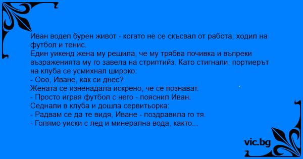 Един уикенд жена му решила, че му трябва почивка и въпреки възраженията му го завела на стриптийз. Като стигнали, портиерът на клуба се усмихнал широко: